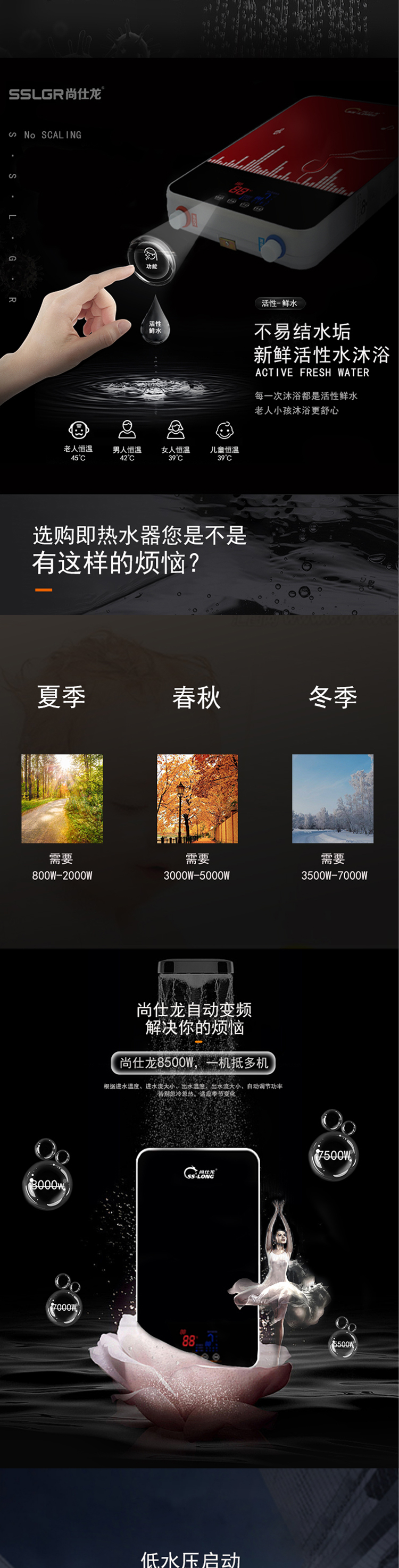 商品名称:尚仕龙2015010706753506商品编号:28221099152商品毛重:6.3kg商品产地:中国大陆操控方式:触控式能效等级:无能效等级容量:40L以下类型:即热式电热水器外观设计:超薄型
